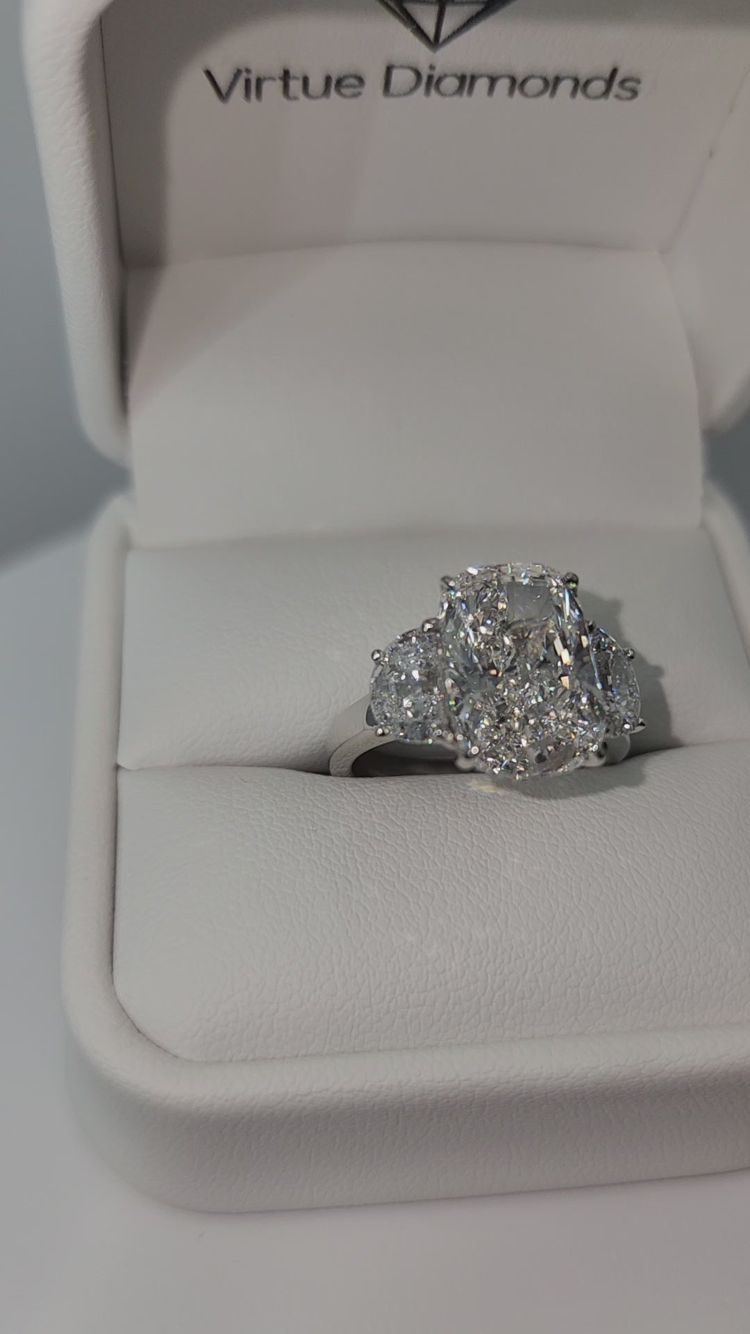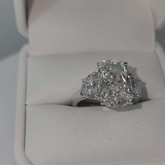 "The Diana" is a 5.51 Carat Elongated Cushion Lab Grown Diamond E/VS1 with 2 Half Moon Side Diamonds