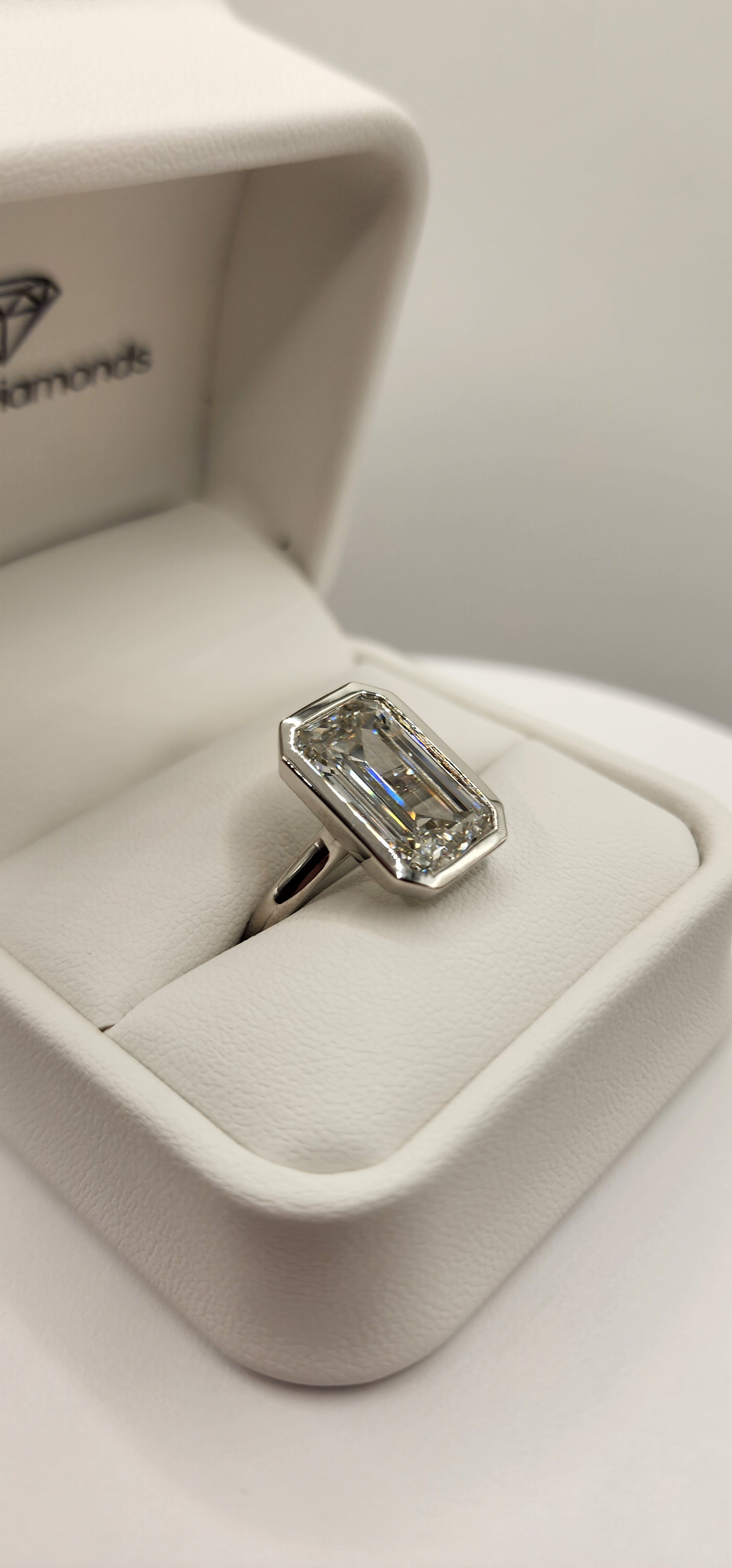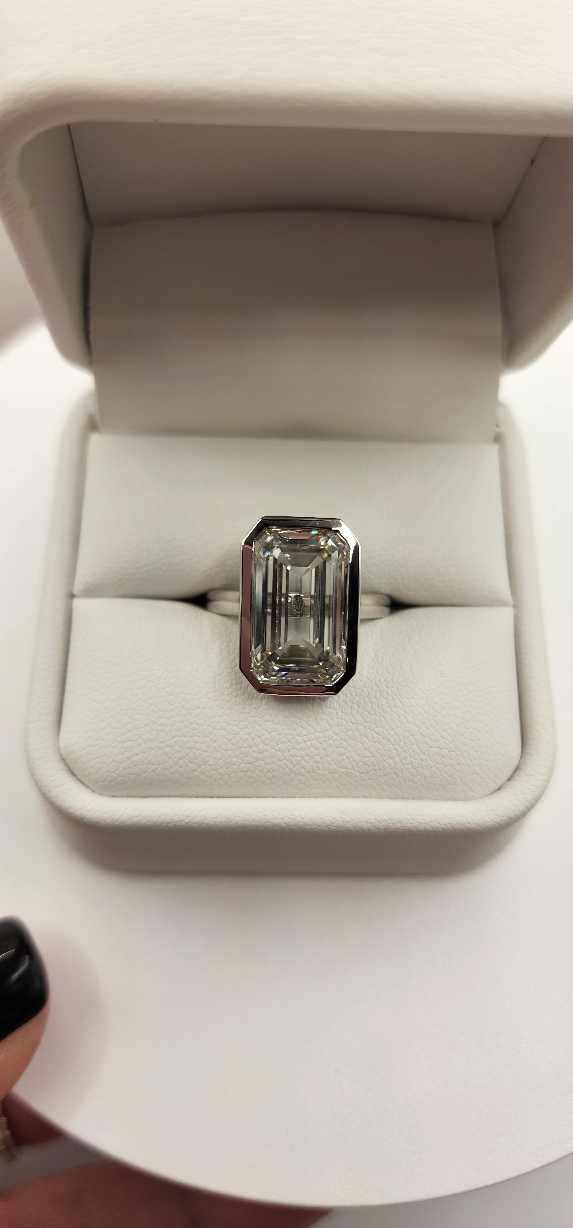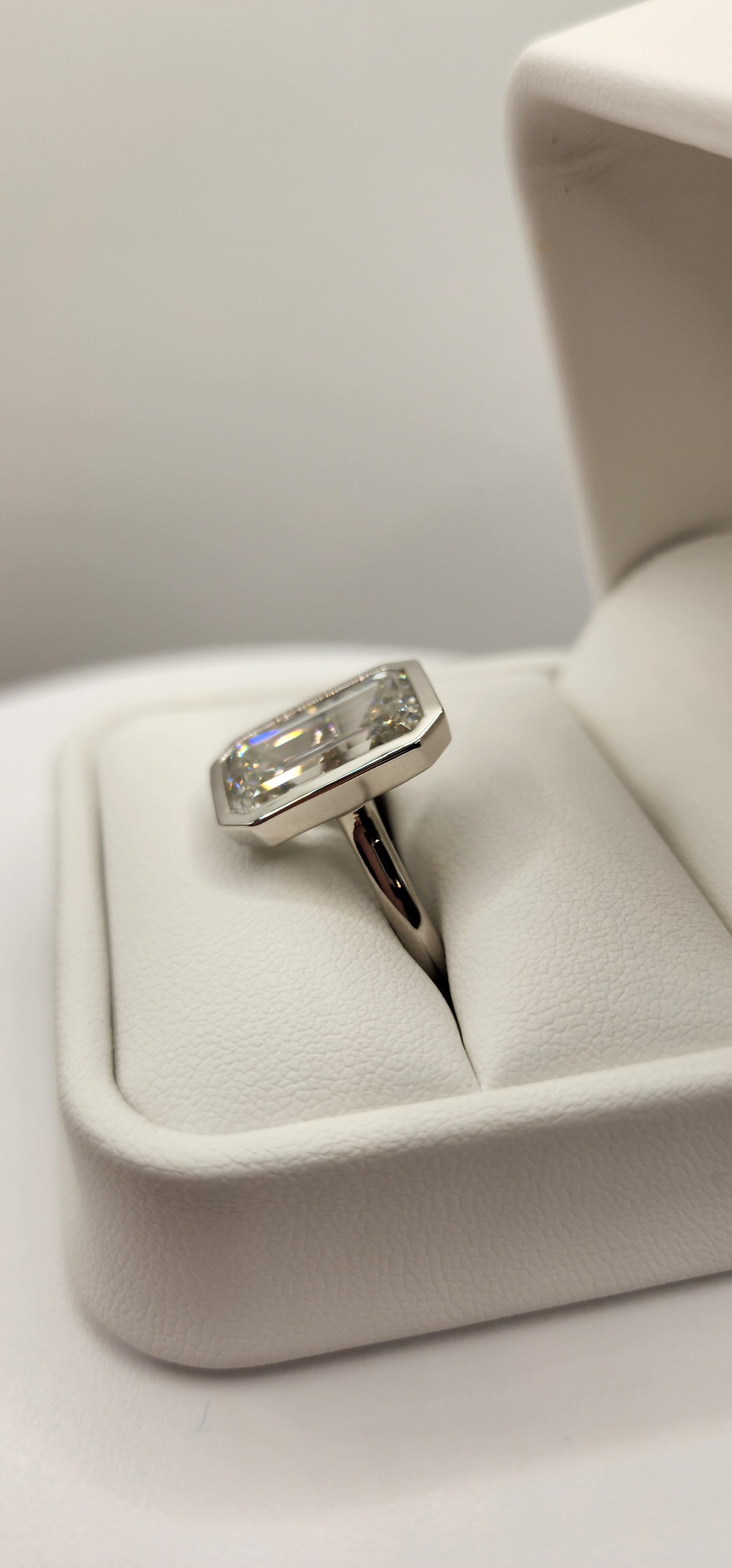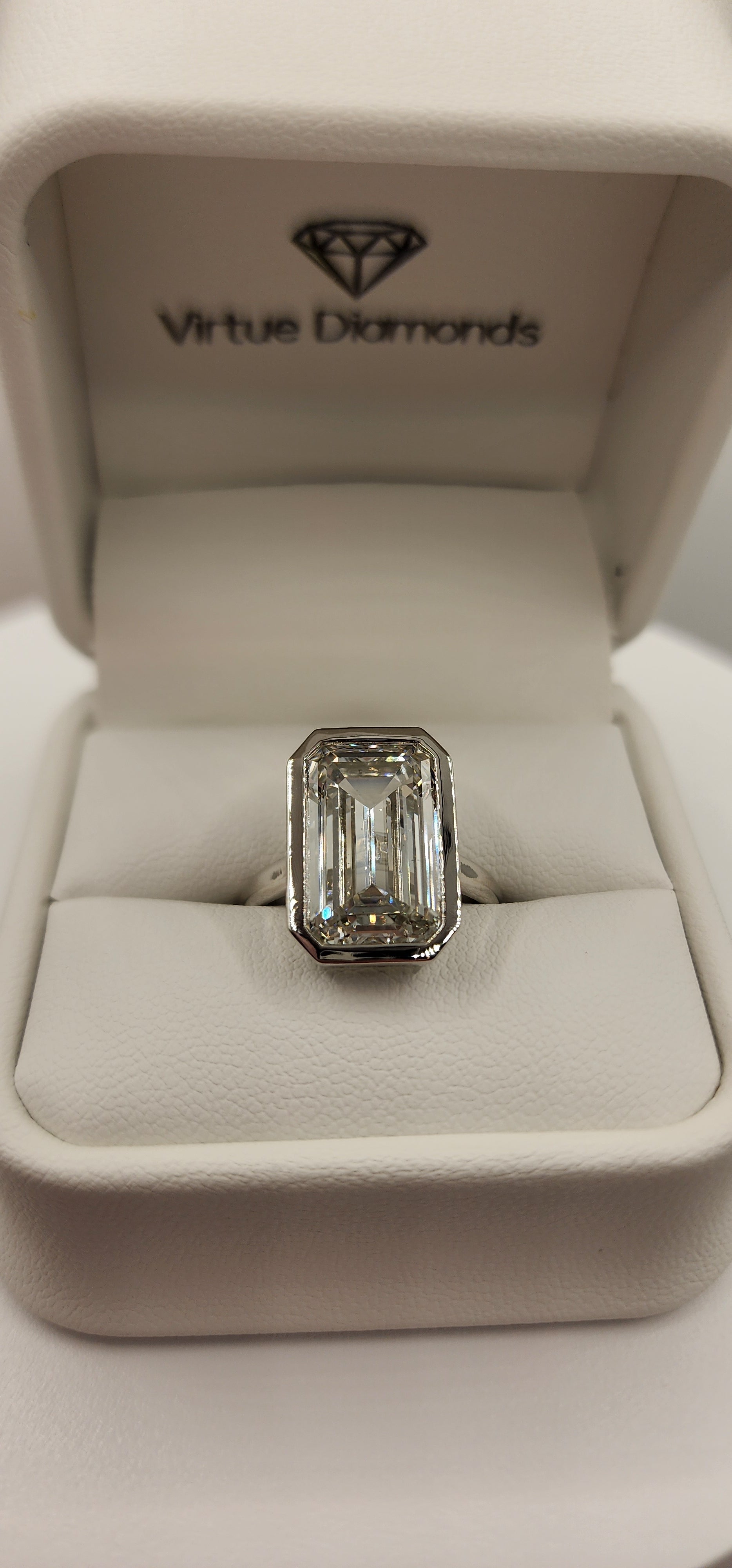 "The Paula" 8.11 Carat Emerald Cut Lab Grown Diamond Ring, IGI Certified F/VS1 in a Sleek Full Bezel Setting