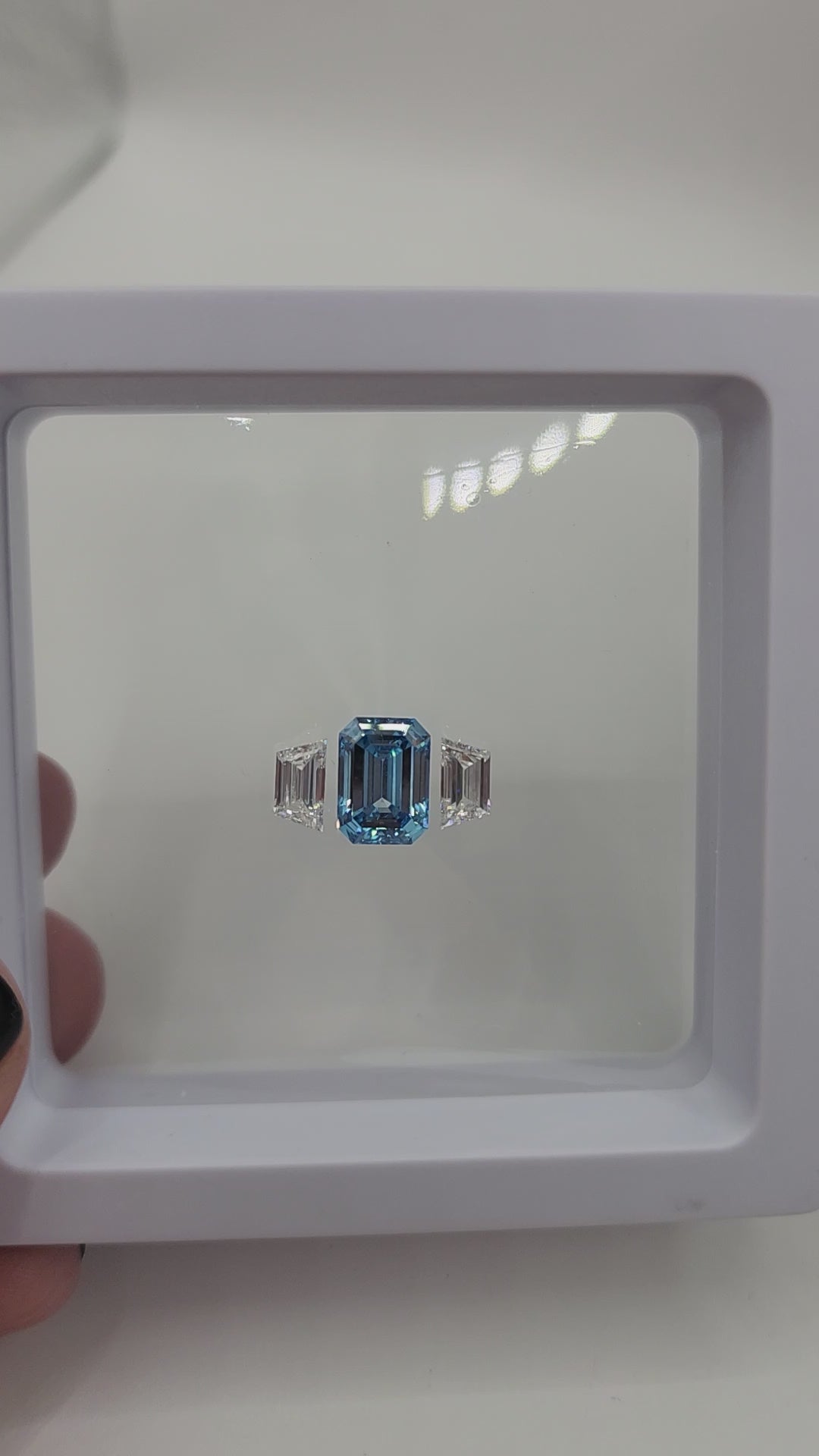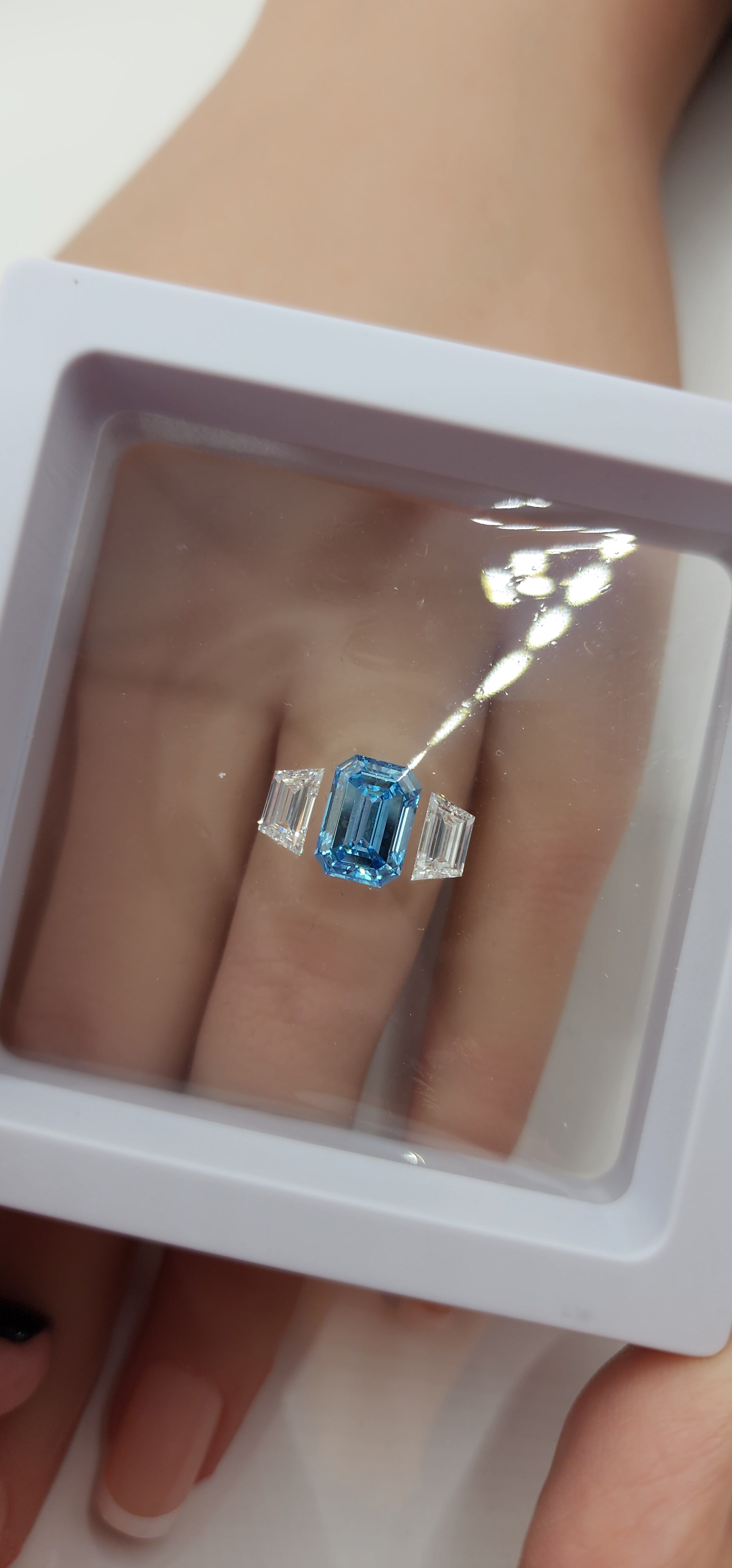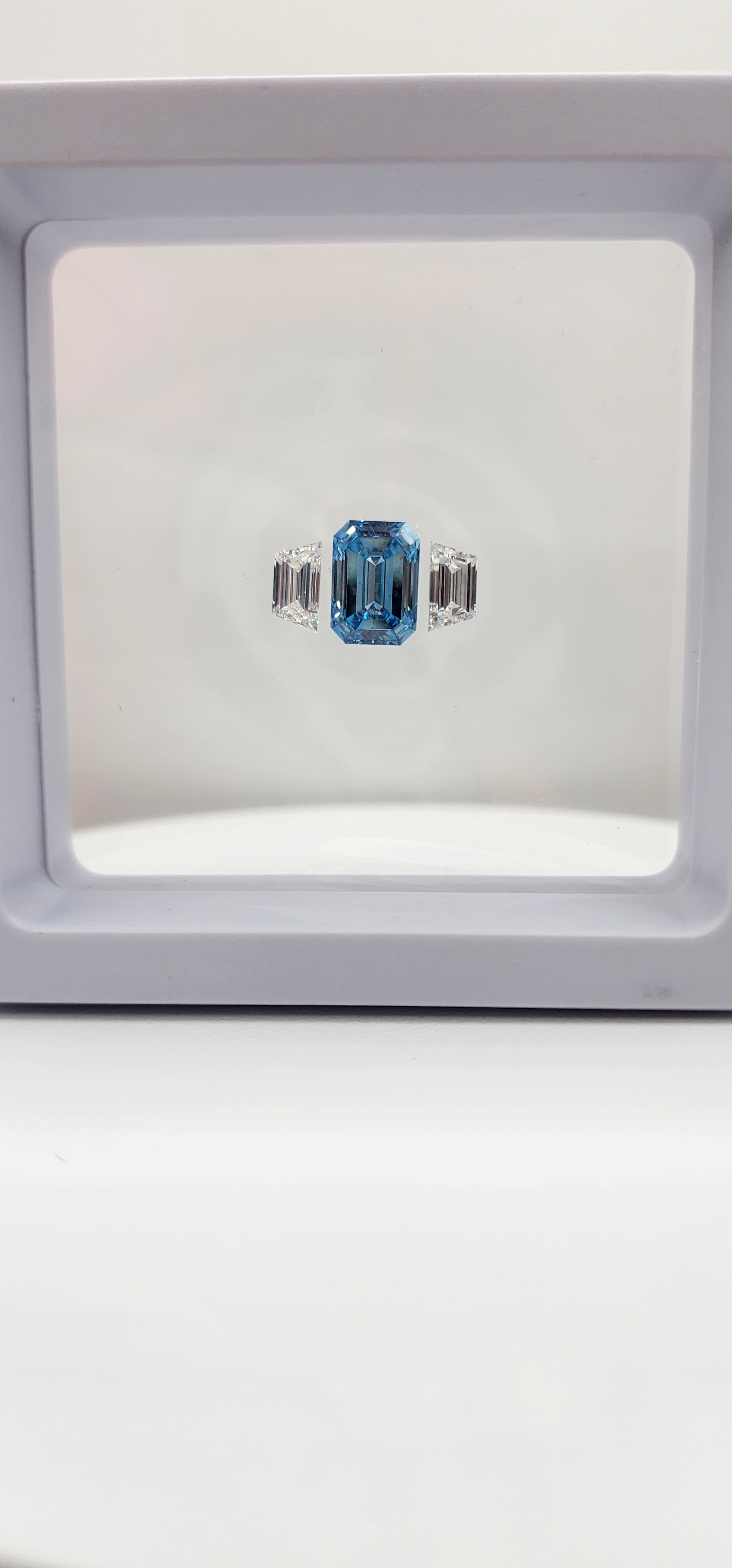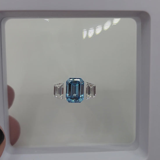 Trilogy Diamond Set (1) 3.04 Vivid Blue SI1 Emerald Cut Lab Grown Diamond & (2) .62 Carat Trapezoids F/VVS2 for Trilogy Ring Setting